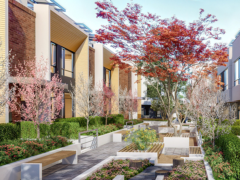 West Oak is designed to provide a seamless connection between your home and the outdoors. Surrounded by vibrant landscaping, an expansive walkable greenway spans the length of the community, connecting Oak Street in front to the laneway behind, providing the perfect place to enjoy the fresh air, take your dog for a walk, and let your children run and play close to home.